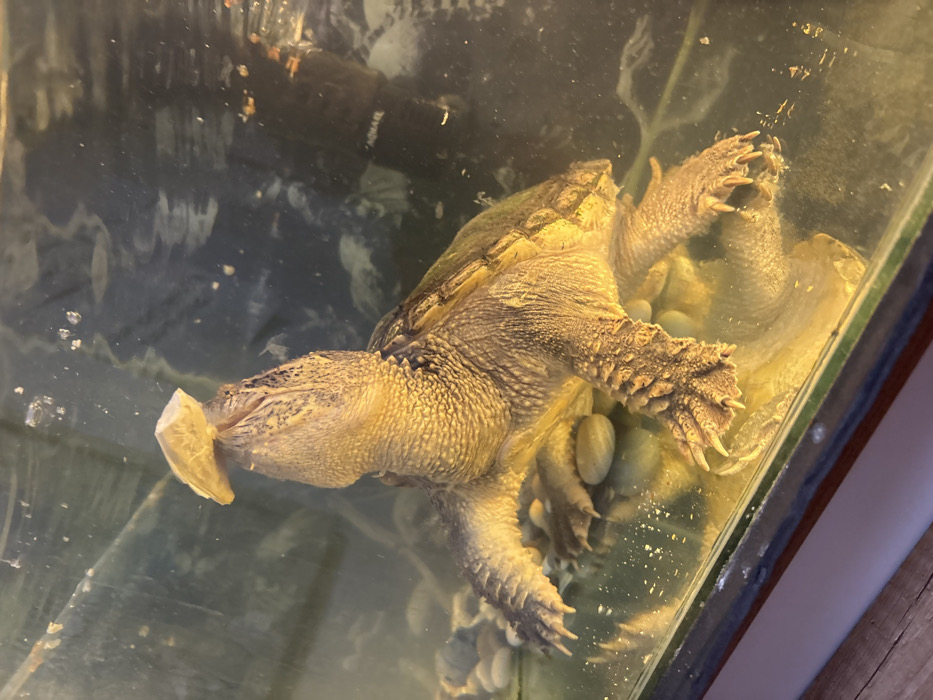 An image displays a large, yellowish-brown common snapping turtle (Chelydra serpentina) positioned inside a clear glass aquarium