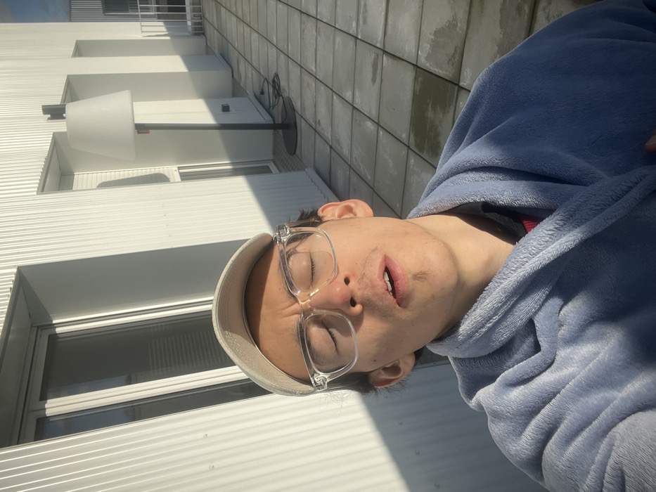 An outdoor scene in Villeneuve-d'Ascq, France, captures a single male individual in a selfie perspective. The subject occupies the foreground, wearing a beige baseball cap, clear-framed rectangular glasses, and a light blue plush bathrobe. His eyes are closed, and his mouth is slightly open, with his face illuminated by direct sunlight from the right. A faint mustache and soul patch are visible on his face. The background features the white, corrugated metal exterior of a modern building, displaying multiple vertical windows or doors with white frames and partially raised roller shutters. To the right of the subject, a tall black outdoor floor lamp with a white conical shade stands on the paved, light grey square-tiled ground, where a black electrical cord is visible. Shadows from the building and lamp indicate strong, low-angle sunlight.