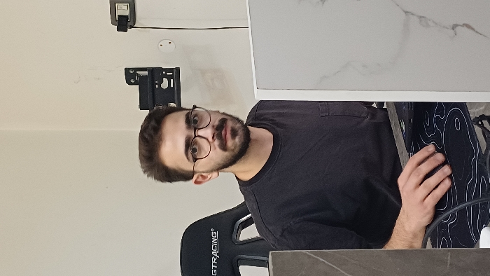 The image depicts an indoor scene located in Rukn ad-Din Municipality, Syria. A male individual, appearing to be in his 20s or 30s, is seated and positioned centrally, looking directly at the camera with a neutral expression. He has short dark hair, a trimmed beard and mustache, and wears round-rimmed eyeglasses. His attire consists of a plain black short-sleeved t-shirt with a single pocket on the left chest. Behind the individual, a black gaming chair with "GTRACING" branding is visible. His right hand is resting on a black computer mouse, which is placed on a black mousepad featuring white topographic contour line patterns. A portion of a laptop or keyboard is visible behind the mousepad. The background comprises a plain, light-colored wall. To the right of the individual's head, a black metal wall mount, likely for a display, is affixed to the wall. Further right on the wall, an electrical light switch or outlet is visible with a dark-colored plug or adapter inserted. The immediate foreground on both sides of the subject includes vertical panels; a dark gray, subtly marbled panel is on the left, and a white, gray-marbled panel is on the right, suggesting part of a desk partition or furniture.