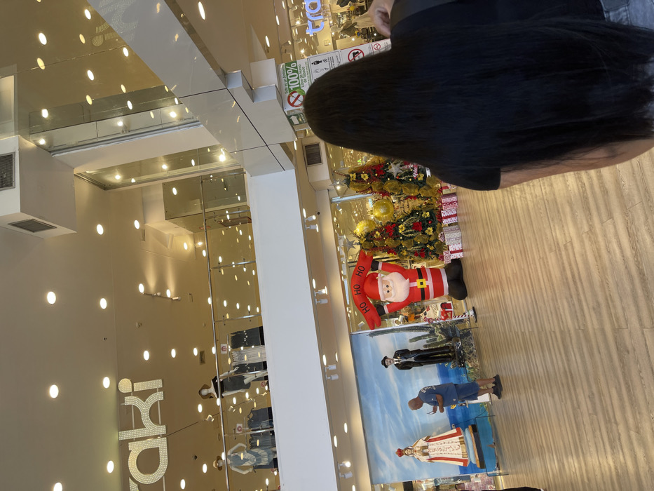 The image displays the interior of a multi-level commercial building, likely a shopping mall or large department store. In the foreground, the back of an individual with long, straight black hair and a dark shirt is visible, facing into the scene. The floor is light-colored with horizontal striations. On the lower level, a detailed holiday display is present. A large inflatable Santa Claus figure, holding a red banner reading "HO HO HO," stands centrally. To its right are two decorated Christmas trees adorned with gold ornaments and red ribbons, surrounded by wrapped gift boxes. To the left of the Santa figure, a large statue of a crowned religious figure in white and gold robes stands on a pedestal. Next to the religious statue, a male mannequin in a dark suit and hat is positioned. Behind these figures, a large backdrop depicts a blue sky above a desert landscape with cacti and palm trees. A male individual, with short hair and a beard, wearing a blue t-shirt and shorts, stands between the religious statue and the male mannequin, facing left and examining an object in his hands. The upper level, accessible via an unseen pathway, features a glass railing behind which three mannequins are displayed, dressed in various garments. An illuminated sign displaying the word "raki" is mounted on the wall of the upper level. The ceiling throughout is white with numerous recessed circular lights. On the lower level, near the right edge, a sign is partially visible, featuring a no-smoking symbol and Spanish text stating "Esto es un ambiente 100% Libre de humo del tabaco" (This is a 100% tobacco smoke-free environment). The specific city and unknown are not identifiable from the visual information provided beyond the indication of a Spanish-speaking region.