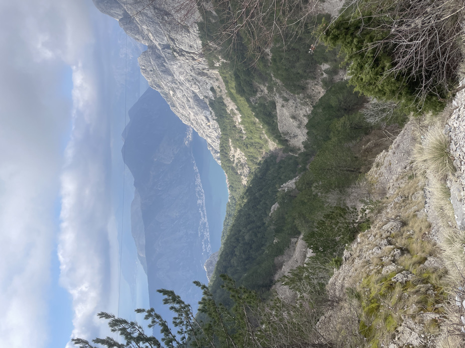 The image displays a panoramic high-angle landscape view from Žanjev Do, Montenegro, looking down into a deep valley towards the Bay of Kotor. The immediate foreground features rugged, rocky terrain with scattered patches of dry, yellowish-brown grass and some green moss. Exposed grey rock formations and gravel are prominent, accompanied by sparse, bare deciduous branches on the right and green coniferous branches partially obscuring the view on the far left. The midground is dominated by a steep, forested valley, densely covered with coniferous trees. Numerous sections of the valley walls are exposed as grey rock faces and scree slopes. Towards the lower right portion of the valley, a small, indistinct object with visible orange, white, and red elements is situated amidst the trees and rocks. Faint, thin horizontal lines, consistent with overhead power lines, are visible across the upper mid-distance. The background presents the calm, blue waters of the Bay of Kotor, bordered by a coastal settlement featuring a collection of white and light-colored buildings along the shore. Beyond the bay, successive layers of mountains extend into the distance, appearing hazy with atmospheric perspective under a partially cloudy sky. Patches of blue sky are visible through the clouds. No people are discernible within the frame.