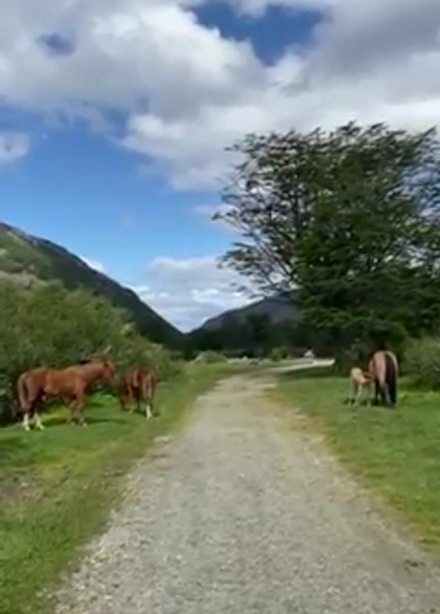 gravel path leading into a valley with mountains on either side. The sky is blue with scattered white clouds. On the left side of the path, two brown horses are grazing in the grass. On the right side, a dark-colored horse stands with a smaller, lighter-colored horse, possibly a foal, near it. A large tree stands near the path on the right. The overall scene is peaceful and rural.