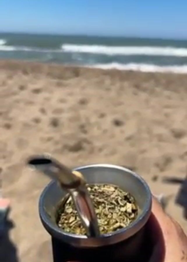 person holding a mate cup filled with yerba mate and a bombilla, set against the backdrop of a beach on a sunny day. The camera is focused on the mate cup, but in the background, you can see the sand, the ocean with waves, and a clear blue sky. A voice can be heard in the background.