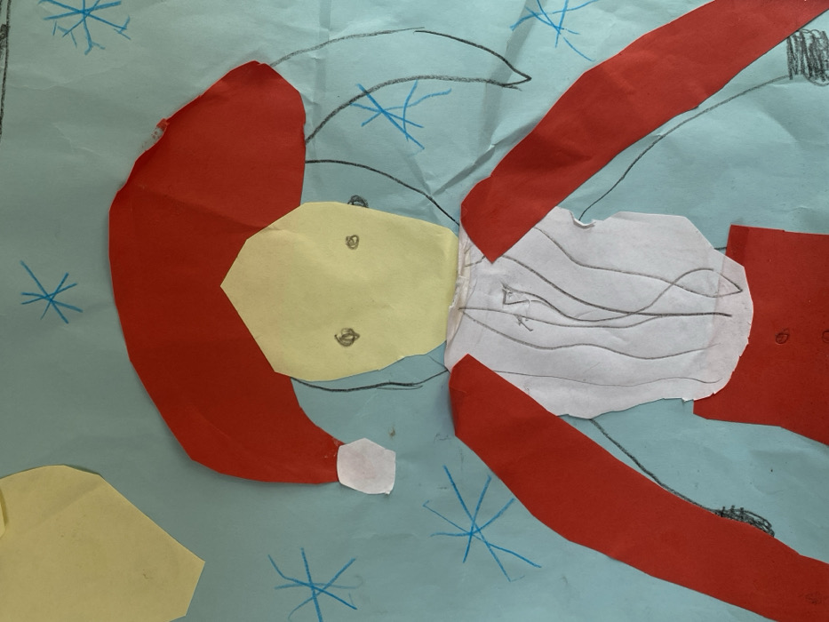 This image is a photograph of a child's mixed-media collage artwork, presented in the context of the city of Dobri dial, Bulgaria. The artwork features a central humanoid figure, likely depicting a winter holiday character such as Santa Claus, against a light blue background. The background is a crumpled light blue paper with multiple blue asterisk-shaped drawings, indicative of snowflakes. In the upper left quadrant, an irregularly cut yellow paper shape is present, possibly representing a celestial body. The central figure's head is fashioned from an irregularly cut light yellow paper, approximately pentagonal, with two small, crudely drawn black circles representing eyes. A large, irregularly shaped red paper hat, consistent with a Santa hat, covers the top of the head and extends laterally, featuring a small, white, irregularly shaped paper pom-pom attached to its left peak. Below the head, the torso is composed of an irregularly cut white paper piece, detailed with several vertical, wavy black lines. Red paper strips form the arms, extending from the torso; the left arm is mostly visible extending downwards to the left, and the right arm is partially visible extending downwards to the right. The lower body is represented by a red paper piece, partially visible beneath the white torso, with two small black circular markings that resemble buttons. Additional thin black lines are drawn on the blue background, possibly indicating hair or outlining parts of the figure.