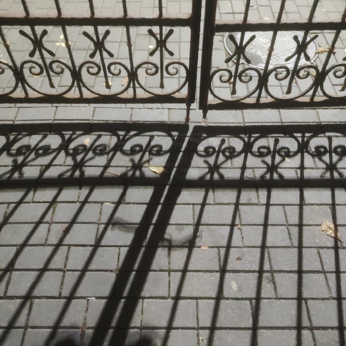 - "The image displays a ground-level view of a dark, ornate wrought iron gate or fence section positioned over grey, rectangular paving stones in Hrodna, Belarus" by FM-TzA0d2, licensed under CC BY 4.0