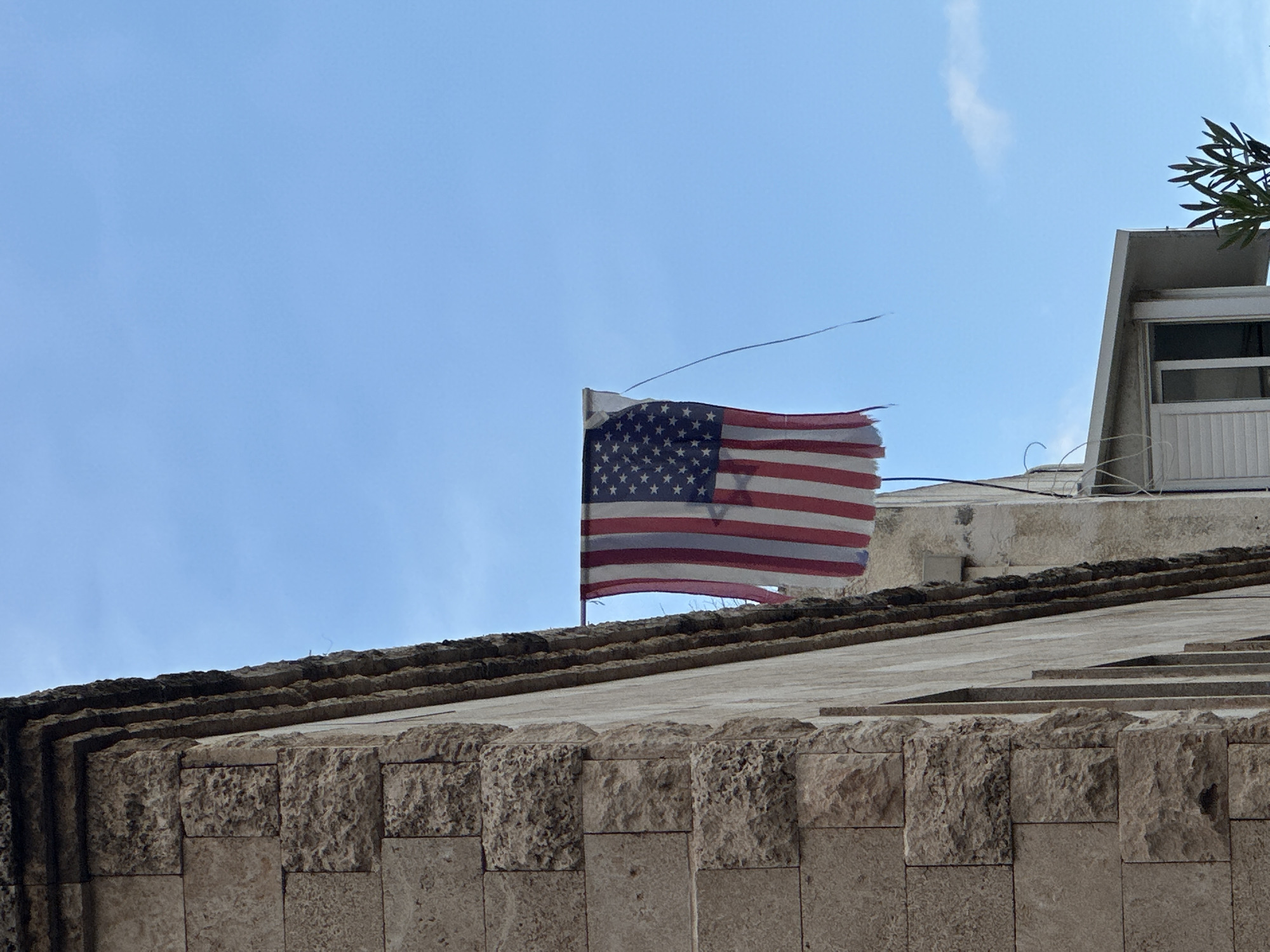 The image displays a tattered American flag hanging vertically against a clear blue sky in the city of Unknown, Unknown. The flag, oriented with its canton to the upper left, exhibits significant fraying and tearing along its lower and right edges. A thin, dark string or cord dangles from the flag's upper left corner. To the left, a building's corner is prominently featured, constructed from light-colored, rough-hewn stone blocks, with multiple horizontal architectural bands near its top. Below and to the right of the flag, a section of a second, lighter-colored building is visible, featuring a window with a white louvered shutter situated beneath a white awning or overhang. A green leafy plant is partially visible in the lower right foreground. The overall environment is an urban setting under bright daylight. No individuals are present in the scene.