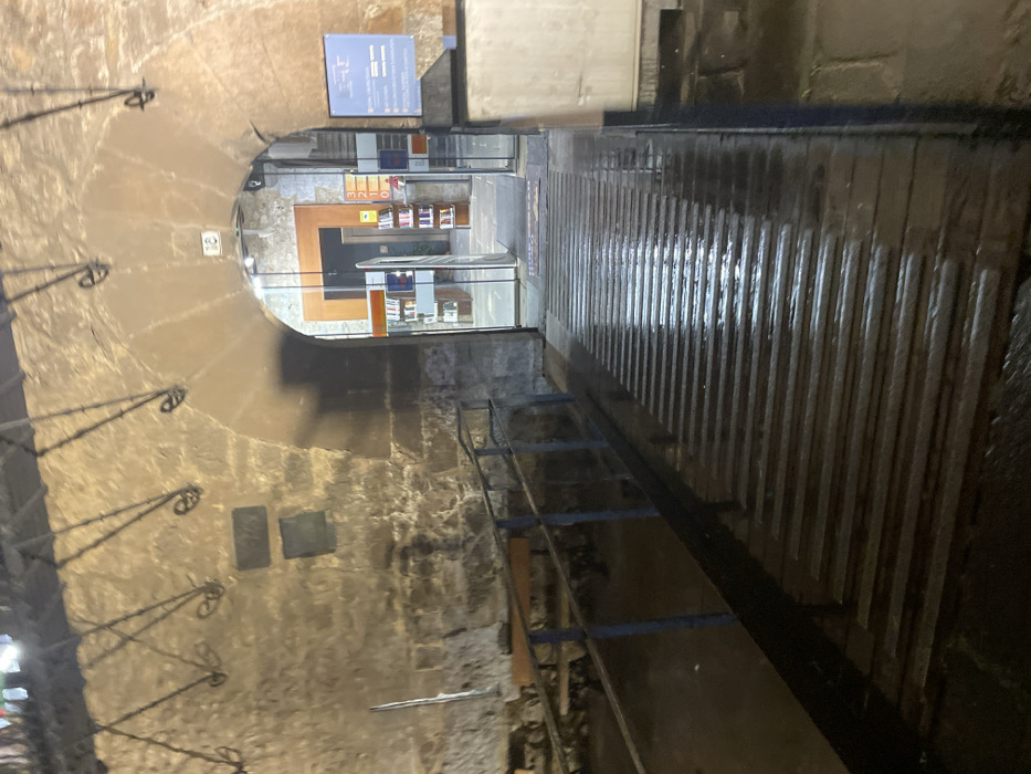 An interior shot depicts a stone tunnel leading to a bright opening. To the right, a metal walkway with a ladder-like structure alongside it runs parallel to the tunnel. The tunnel's stone wall has aged, with visible metal supports. Through the tunnel's opening, a well-lit interior space with shelves and signage is visible.