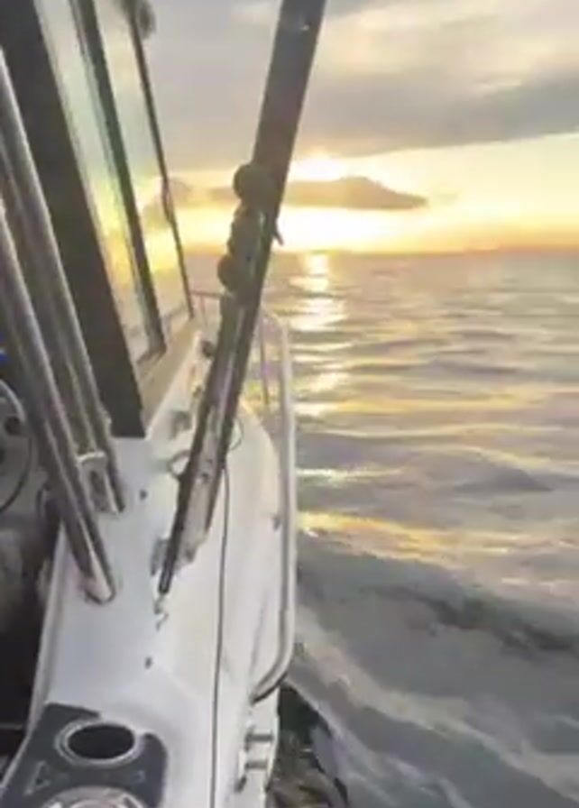 view from inside a motorboat moving across water. A person is seated in the driver's seat of the boat. The camera pans to the right, showcasing a fishing rod secured on the side of the boat and then the ocean. The sun is setting on the horizon, creating a beautiful orange glow on the water and in the sky which is dotted with clouds. The water is choppy. The boat is cutting through the water, creating a white wake.
