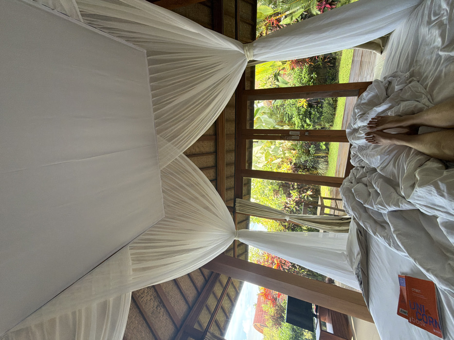 A bedroom with a four-poster bed draped in white mosquito netting dominates the view. The bed is unmade, with wrinkled white sheets and bare feet visible at the edge. A book with an orange cover sits on the bed. Through open glass doors, lush greenery is visible, suggesting a tropical setting. The room features a thatched roof and wooden beams, adding a rustic touch to the scene. A television is mounted on a pole.