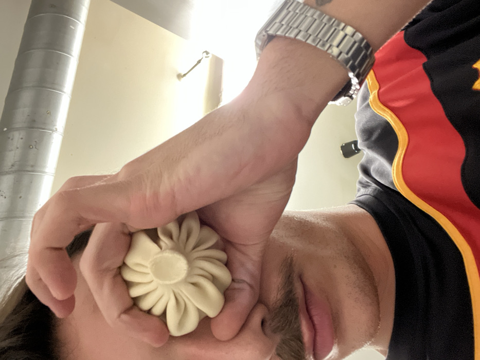 - "A person with fair skin and a watch is holding a large, pleated dumpling-like object with a button center, obscuring their face" by FM-T5Wdg1, licensed under CC BY 4.0