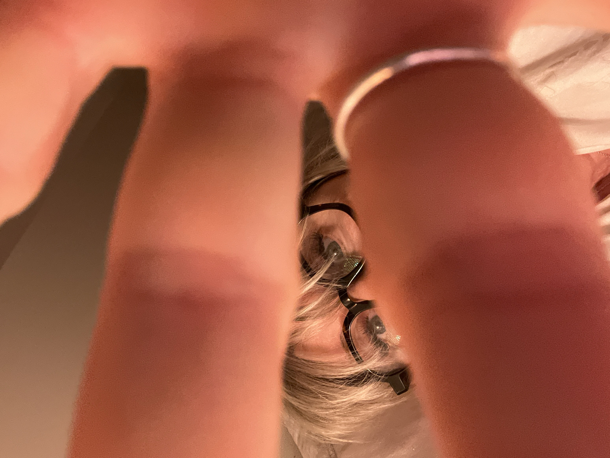 person with blond hair and glasses, partially obscured by the person's outstretched arms