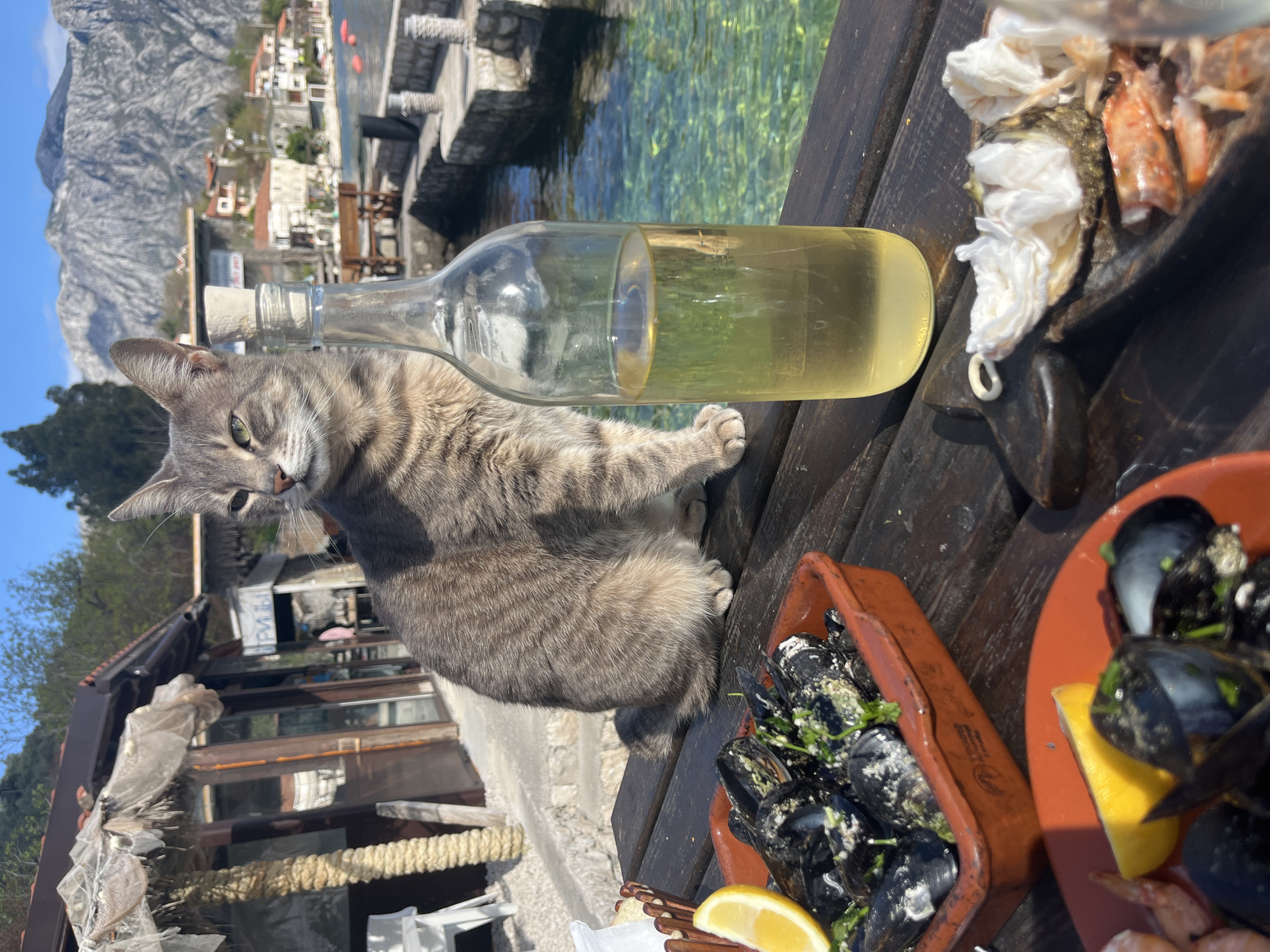 The scene takes place in Dražin Vrt, Montenegro. In the foreground, on a dark wooden surface, is an array of food: two terracotta dishes, both holding mussels garnished with lemon, and a plate with what appear to be cooked prawns and oysters. Resting on the surface, partially obscured by a gray tabby cat, is a glass bottle containing a yellowish liquid. The cat is sitting upright, its front paws on the bottle, its gaze directed towards the camera. The background shows a body of water with small boats and building structures. On the left, there is a partially obscured building. A mountain range is visible in the distance. The overall lighting is bright, suggesting it is daytime.