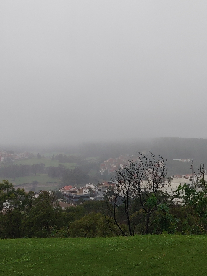 Overcast view from a grassy hill overlooking a town nestled in a valley. Buildings, some with red roofs, are partially obscured by heavy fog. Trees and vegetation are visible in the foreground and middle ground. A bare tree stands out in the foreground, with green foliage to the right. The sky is a solid gray, adding to the overall atmospheric and obscured scene.