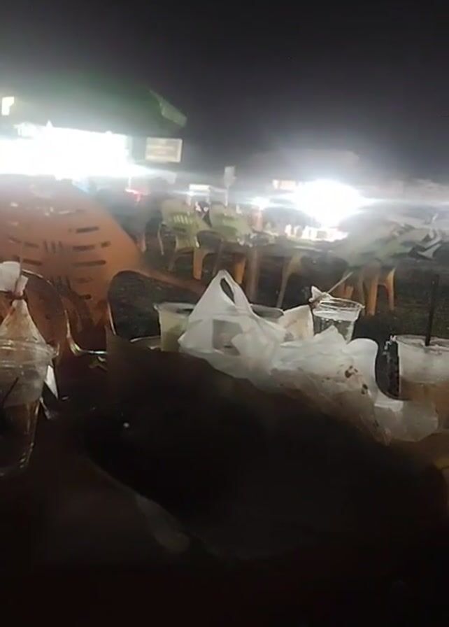 night scene at what appears to be an outdoor food stall area. There are multiple orange plastic chairs, some stacked, and tables with plastic cups, plastic bags, and food remnants on them. The area is illuminated by bright, white lights from the stalls. The camera is mostly static, providing a view from a low angle, focusing on the nearby table. The overall scene suggests a casual, outdoor dining or gathering spot.