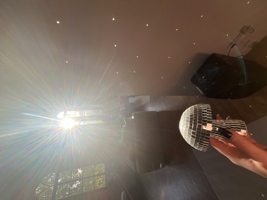 The scene is an interior room within a building in Roubaix, France. In the lower-center, a fair-skinned hand with dark blue polished fingernails grips a mushroom-shaped object composed entirely of small, square mirror tiles. Intense natural sunlight streams through two tall, arched windows in the background, generating a prominent lens flare and sunburst effect. This light, reflecting from the mirrored object, casts numerous small, circular bright spots onto a light-colored wall on the right side of the image. Through the windows, green foliage is visible. The room's interior features a dark wooden floor and a partial view of a light-colored sofa or armchair with cushions in the middle-left background. A dark, rectangular electronic device with attached wiring rests on the floor in the lower-right. No other individuals are present.