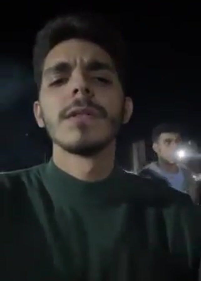 young man with dark hair and a mustache standing outside at night. He is wearing a green sweater and is smoking a cigarette or vape. There are other people behind him, out of focus. The background is dark, with some lights visible in the distance.