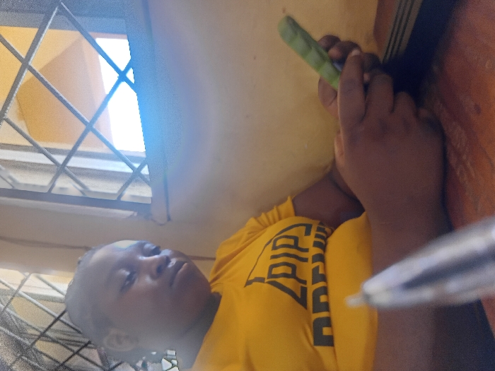 A person in a yellow shirt is holding a phone. The person is positioned next to a wall and a barred window. The background is blurred, making it difficult to discern details. A pen is also present in the frame. The person appears to be looking at the phone screen.