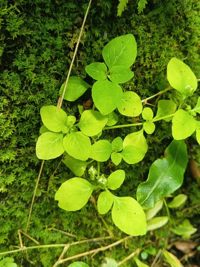 The image depicts a close-up, top-down view of a vibrant green botanical scene, located in Tây Ninh, Vietnam. A cluster of herbaceous plants with multiple bright green, broadly ovate leaves, exhibiting visible venation and some minor dark specks, dominates the foreground and midground. The plants grow from slender green stems, some of which bear tiny white, incipient floral structures. This flora is rooted in a dense, uneven carpet of dark green moss that covers the background. A thin, dry, light brown stem or vine extends diagonally from the upper left towards the center. In the lower right quadrant, a single, larger, darker green leaf with a slightly textured, possibly rippled surface is partially visible. The scene is static, devoid of human subjects, animals, or artificial objects. No discernible actions or interactions are occurring within the natural, presumably humid environment.