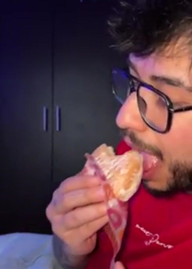 Here's a concise description of the video: A person with a beard and glasses is eating a donut