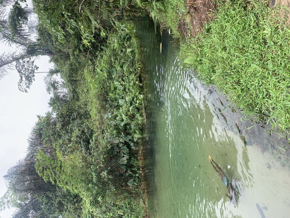 The image depicts a natural aquatic environment in Ikot Obio Ata, Nigeria, under an overcast sky