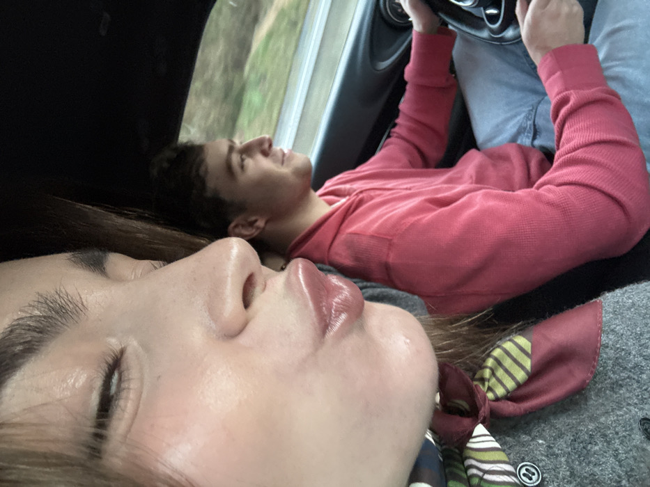 Two people are in a car. The person closest to the camera has long brown hair, fair skin, and wears a patterned scarf. Behind them lies another person in a pink top with hands on the steering wheel. Both appear to be relaxed. The background shows a blurry outdoor scene through the car window.