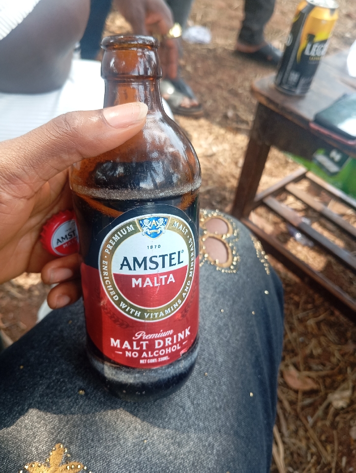 - "A close-up outdoor photograph depicts a dark-skinned hand holding an opened 330ml amber glass bottle of Amstel Malta, a non-alcoholic premium malt drink" by FM-6d4nU2, licensed under CC BY 4.0