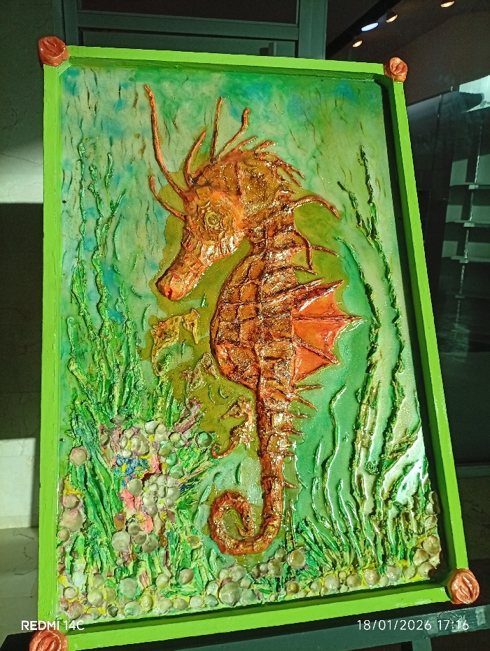 A textured mixed-media artwork depicts a seahorse amidst aquatic plants and a seabed