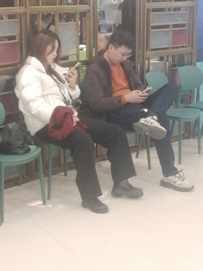 The scene is an indoor waiting or lounge area located in Dongcheng District, China. The floor is light-colored tile. In the background, wooden-framed partitions with frosted or semi-transparent panels are visible. Two individuals, an East Asian female and an East Asian male, are seated on separate teal-colored chairs. The female, positioned on the left, wears a white puffer jacket, black pants, and dark, chunky-soled shoes. A dark red knitted scarf is draped over her lap. A black bag rests on the empty teal chair to her immediate left. She holds a white smartphone with both hands and is looking down at its screen. A camera with a strap is visible hanging around her neck. The male, positioned on the right, wears a dark brown hooded jacket over an orange long-sleeved shirt, dark pants, and light-colored sneakers with prominent soles. He wears eyeglasses and is also looking down, operating a white smartphone held in both hands. His left leg is crossed over his right knee. Another empty teal chair is positioned to his right. Both individuals are independently occupied with their smartphones, exhibiting no direct interaction with each other.