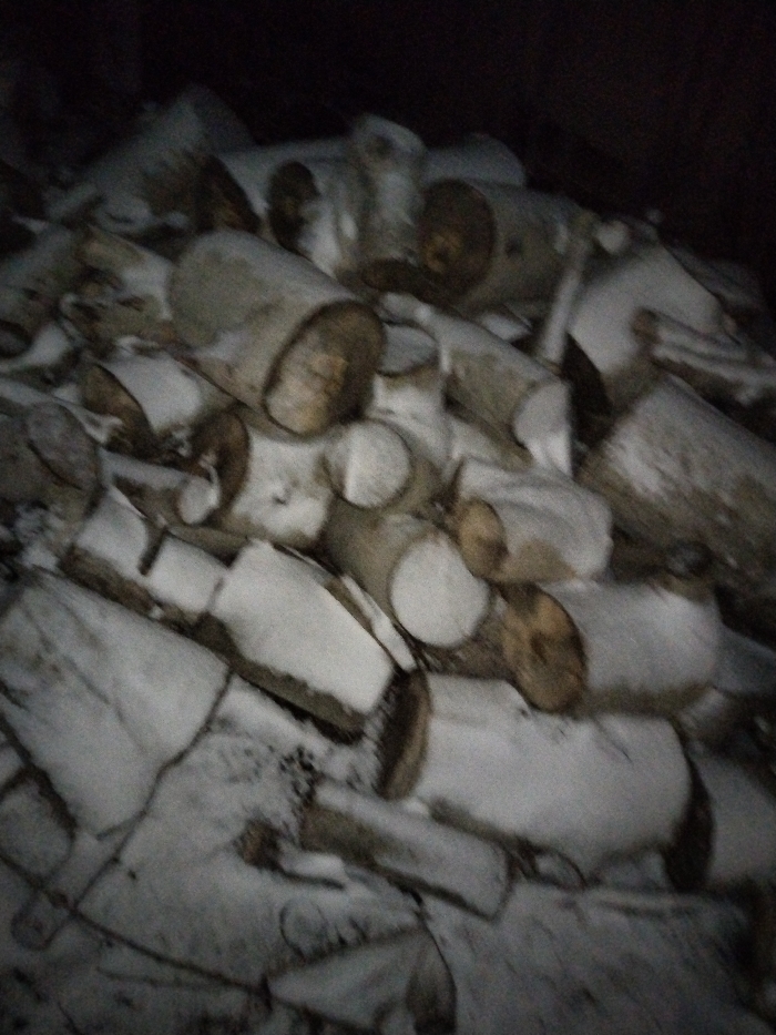 A close-up shows a pile of cut logs, many coated with a thin layer of snow or frost. The logs vary in size and shape, some cylindrical and others more irregular. The ends reveal wood grain. The lighting is dim, creating shadows and obscuring details in the background, which appears to be dark and out of focus. The overall impression is of a stockpile of firewood stored outdoors in winter.