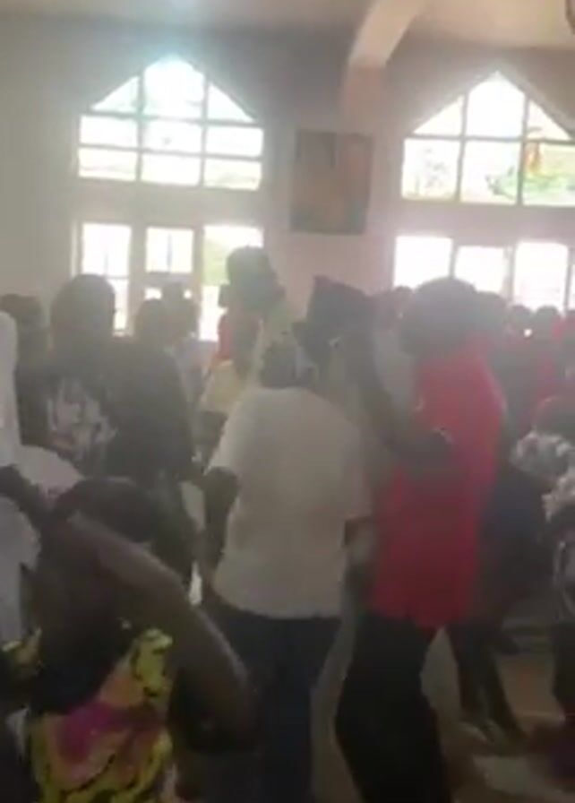 crowded room with many people dressed in a variety of clothes, including white robes, brightly colored African prints, and solid colors like red and black. People are moving, dancing, and some are raising their hands in the air. There is a drum being played and other musical instruments contributing to a lively atmosphere. The room appears to be a church, indicated by the presence of stained-glass windows and a religious banner on the wall. The lighting is bright, and the video is shot from within the crowd, giving a close-up perspective of the activity.