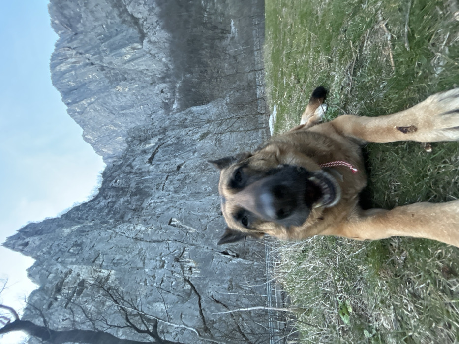 An adult German Shepherd, with tan and black fur, lies prone on green grass in the foreground. Its head is centered and prominent, facing directly towards the camera with its mouth slightly open, revealing teeth. A red and white striped cord is visible around its neck. A small piece of dark organic debris adheres to its front right leg. In the background, towering grey limestone cliffs of the Vratsa Mountains, part of the Vratsa Balkan, dominate the scene under a clear blue sky. Sparse, leafless trees are visible on the lower mountain slopes and in the mid-ground. A metal guardrail, indicative of a roadside, is present on the left side of the mid-ground. The image depicts an outdoor scene in the vicinity of Vratsa, Bulgaria.