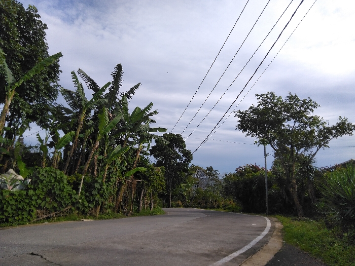 The image displays an asphalt road in Berger, Norway, curving rightwards under a largely overcast sky with white and gray cloud formations. A solid white line delineates the right edge of the pavement. The left side of the road is bordered by dense tropical-appearing vegetation, primarily characterized by numerous tall banana plants with broad, somewhat tattered leaves, and an undergrowth of climbing vines. Five utility wires are strung overhead, extending diagonally from the upper left to the upper right. The right side of the road features a narrow grassy shoulder adjacent to a diverse array of foliage, including a prominent tree with a full canopy and other bushy plants, some exhibiting spiky leaves. A slender, dark-colored utility pole stands vertically amidst the vegetation on the right. The scene contains no visible people, vehicles, or animals. Distant landforms are indistinctly visible on the horizon.