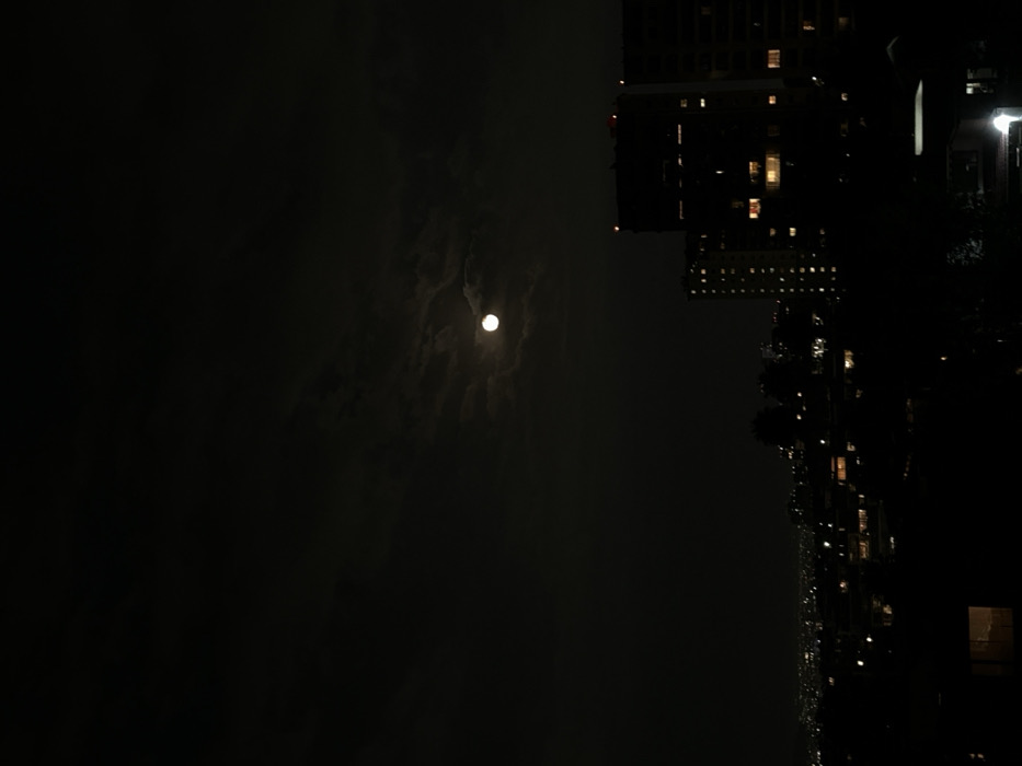 At night, a full moon shines through the clouds. Tall buildings stand to the right, their windows dimly lit. The sky is dark and cloudy. Silhouettes of trees are visible along the buildings. The image is slightly out of focus, adding to the dreamlike quality of the night scene.