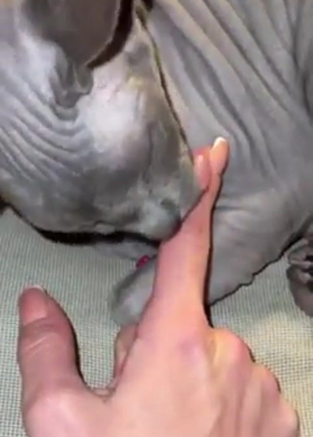 close-up shot of a hairless cat, likely a Sphynx, lying on a light-colored textured surface that could be a couch or chair. A hand is positioned near the cat's face, and the cat is shown licking the index finger. The focus is primarily on the interaction between the hand and the cat.