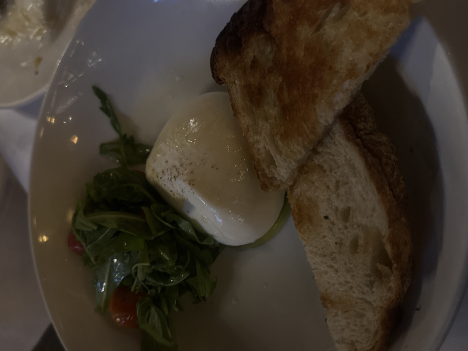 The image displays an appetizer presented in a white, shallow bowl. A large, approximately spherical portion of burrata cheese, lightly dusted with black pepper, rests centrally in the bowl, seemingly atop a small pool of olive oil. To the left of the burrata, a cluster of dark green arugula leaves is arranged, interspersed with several small, red cherry tomatoes. Two slices of toasted bread, exhibiting golden-brown crusts and some darker charring, lean against the exterior of the bowl's rim, partially overlapping. The scene is dimly lit, suggesting an indoor restaurant setting. Reflections of ambient light sources are visible on the polished surface of the white bowl. No individuals are present, and no actions or interactions are depicted. The specific city of Santiago de Querétaro, Mexico, cannot be confirmed from the visual information provided in the image.