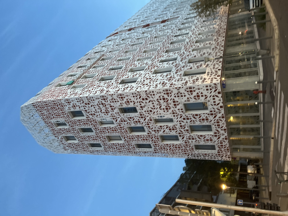 The image depicts a modern, multi-story building located in Marseille, France, specifically at the intersection of Quai d'Arenc and Rue de Chanterac in the Euroméditerranée district. The structure, appearing wedge-shaped from this perspective, features a distinctive facade composed of a white, intricately perforated screen with a geometric, lace-like pattern, overlying a red or reddish-brown exterior. Numerous rectangular windows are visible through the screen across its approximately seven to eight floors. A small, bright green fabric object is visible protruding from an upper-level window on the building's right side. The ground floor is characterized by extensive clear glass panels. The scene is set at dusk or early evening, evidenced by the clear, light blue sky with faint cirrus clouds and the illumination of street lamps. In the immediate foreground, a paved street features a white zebra crossing. Along the sidewalk, multiple metal bollards define the pedestrian area. A red fire hydrant is positioned near the building's base. A blue street sign indicating "RUE DE CHANTERAC" is affixed to the building's corner. To the left, a darker, multi-story building with trees behind it is partially visible. A white van is partially observable on the street to the right. No individuals are distinctly visible within the frame.