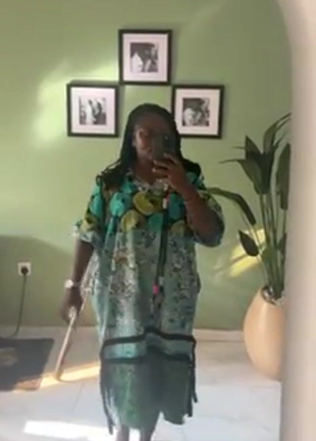 A person standing in front of a mirror takes a picture of themselves with a smartphone. The person is wearing a light green and blue patterned dress with short sleeves and black fringe at the bottom. They have dark hair styled in braids. The person is wearing a watch and a bracelet on their left wrist and earrings. They are standing barefoot on a light-colored tile floor. Behind the person is a light green wall with three framed black and white photos hanging on it. To the right of the person is a large potted plant in a vase. To the left of the person, near the floor, is a scale and a stepladder. The mirror has a rounded top.