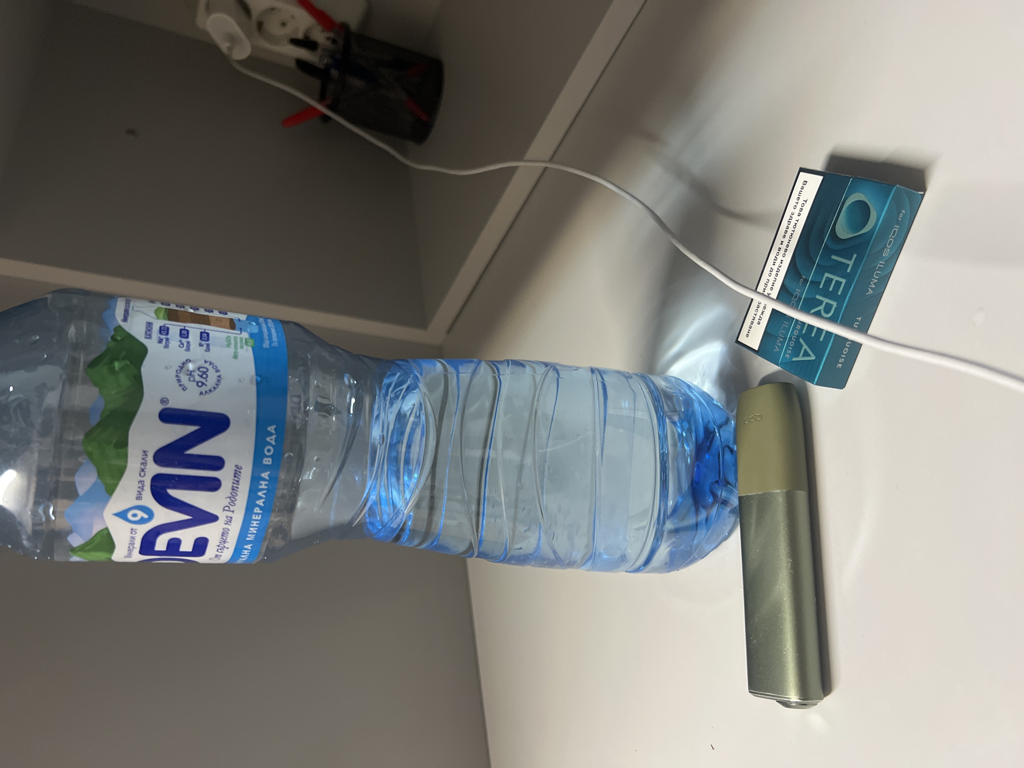 plastic bottle of "Devin" mineral water lying horizontally next to an IQOS Iluma device and a pack of "Terea Turquoise" IQOS Iluma sticks. A white charging cable is connected to the device. The bottle of water has a blue label with green and white mountain imagery, and the label is written in Cyrillic text. The IQOS device appears to be a metallic green color. The packaging for the IQOS sticks is blue and white. The background is a white or light-colored surface, and a white wall is partially visible above. There is also an electrical outlet and some wires visible in the top left corner. The image does not show enough details to identify a precise location in Dolna Mitropolia, Bulgaria.