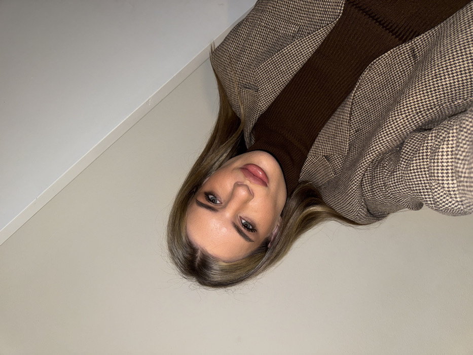 A young woman poses at a slight angle. She wears a brown turtleneck under a houndstooth blazer. Her blonde hair is parted in the middle, framing her face. Her makeup is natural and polished, with defined eyebrows and glossy lips. She has fair skin. The background is a plain white wall with a sharp angle.