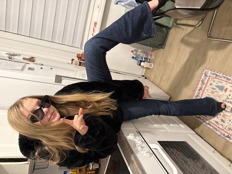 A young woman with blonde hair and sunglasses poses on top of a white oven in a kitchen. She wears a black furry jacket and blue flared jeans. One leg is bent at an angle, her foot adorned with a black heel. Bottles of water and other items are visible on a shelf nearby. A rug with a winter-themed pattern lies on the floor. The camera angle is slightly tilted.