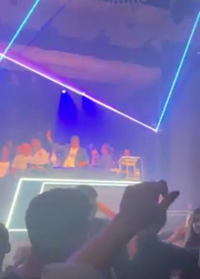 The video captures the energetic atmosphere of a nightclub performance. A brightly lit stage features performers behind a DJ console, illuminated with blue spotlights. Laser lights project patterns across the ceiling, which is visible with industrial-style ductwork and security cameras. In the foreground, a crowd of people is visible, their faces partially obscured, but suggesting an excited and animated mood. The recording seems to be taken from within the audience.