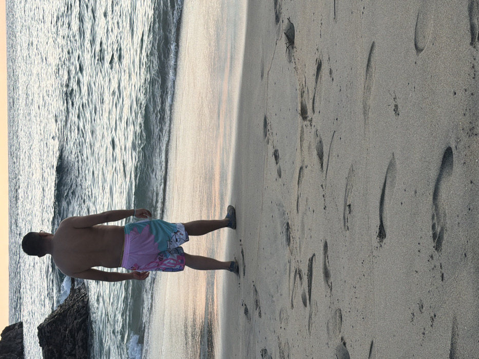 A beach scene with a person standing on the wet sand near the water's edge. The person is wearing patterned swim trunks and shoes. Numerous footprints are visible in the dry sand. Waves are gently lapping at the shore. The overall lighting suggests either sunrise or sunset. The scene is oriented with the sea on the left and the beach extending to the right. A rocky outcrop is visible in the lower left corner.