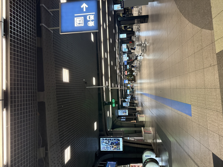 An indoor scene depicts a railway station hallway. A blue sign indicates train access. Along the right, seats face screens displaying information. A blue stripe runs the length of the floor. The ceiling features bright lights and a grid-like structure. A digital clock shows "01:13." The angle of the photograph suggests the image was taken by someone standing and turning the camera.