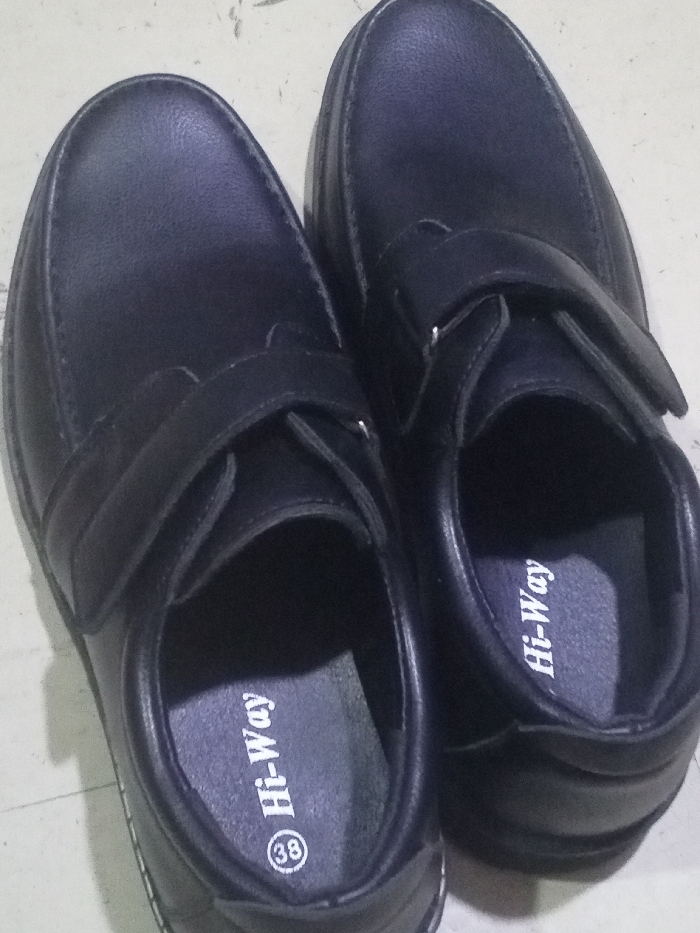The image displays a pair of black, low-cut shoes, likely made of synthetic leather, resting on a light-colored, possibly tiled or concrete, floor. Each shoe features a single strap closure with a hook-and-loop (Velcro) fastening system over the instep. The brand name "Hi-Way" is visible in white lettering on the dark insoles of both shoes. The insole of the shoe on the left prominently displays a circled "38," indicating the shoe size. The shoes appear to be new or minimally worn. They are positioned side-by-side, oriented with their toes pointed towards the top-left of the frame. The immediate environment is an indoor, evenly lit space. The specific location within Lagos, Nigeria, cannot be determined from the visual content of this image.