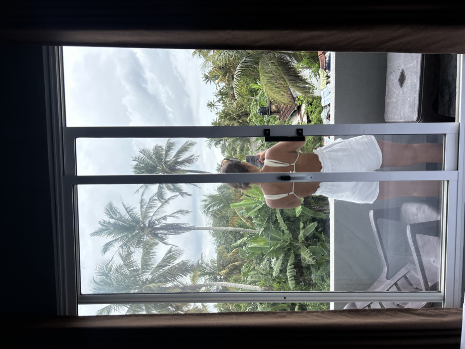 From a window, a person with brown hair is taking a selfie, holding a phone to their face. The person is wearing a white, open-back top and matching shorts. Outside the window, palm trees and other lush greenery are visible under a cloudy sky. A balcony with a chair and possibly a cushion are seen through the reflection in the glass. Brown curtains frame the window at the top and bottom.