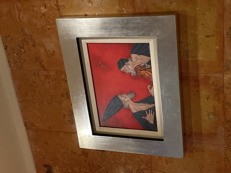 A framed painting hangs on a textured wall. The painting features two male figures against a red backdrop. One figure wears a black hat and robe, his face upturned with an open hand. The other, also wearing a black head covering, gazes downward. Between them is a grouping of orange, brown, and white objects. A small, dragonfly-like insect appears in the upper left corner of the painting. The frame is silver-toned and slightly angled.