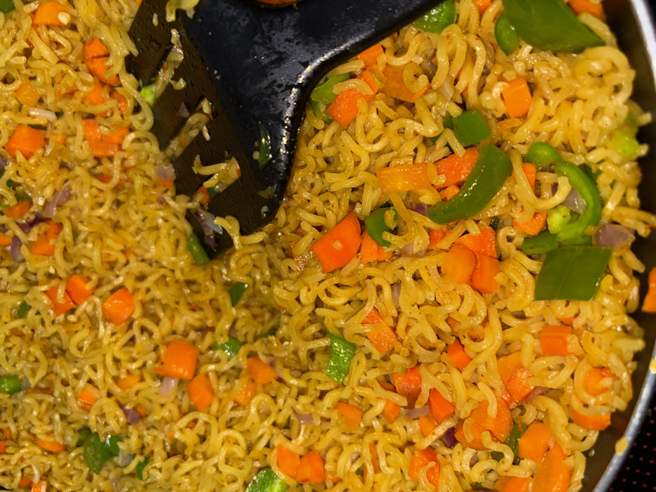 A close-up shot reveals a dish of stir-fried noodles mixed with diced carrots, green bell peppers, and onions. The noodles appear golden brown, interspersed with the vibrant orange and green of the vegetables. A black spatula rests on the noodles, suggesting the dish is being stirred or served. The focus is sharp, highlighting the texture of the noodles and the freshness of the ingredients.
