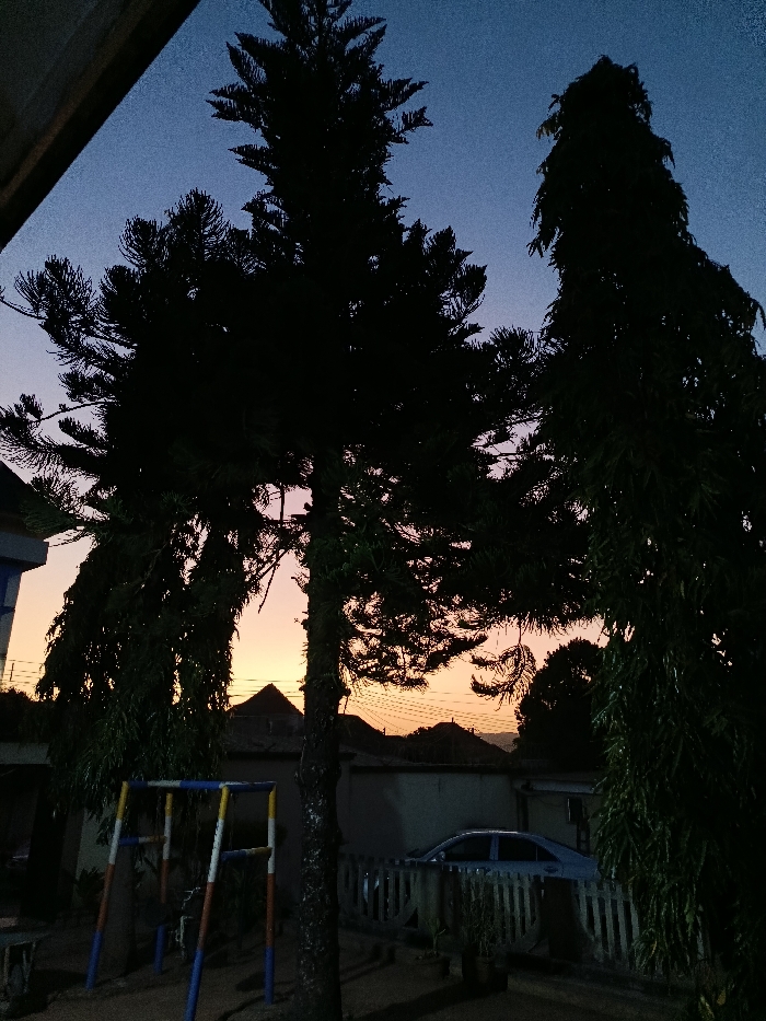 This image depicts a residential or semi-residential scene in Kabong, Nigeria, at dusk or dawn. The sky gradient transitions from a warm orange-pink near the horizon to a dark blue overhead. Dominating the midground are two tall, dark, coniferous-like trees, silhouetted against the sky. In the foreground, partially obscured by shadow, is a multi-colored children's swing set with blue, red, and yellow painted components. To the right of the swing set, behind a low, light-colored picket fence, a light-colored sedan is parked parallel to a concrete block wall. In the background, beyond the trees and structures, outlines of additional buildings with peaked roofs are visible against the horizon, followed by faint silhouettes of distant hills or elevated terrain. No individuals are present, and no actions or interactions are depicted.