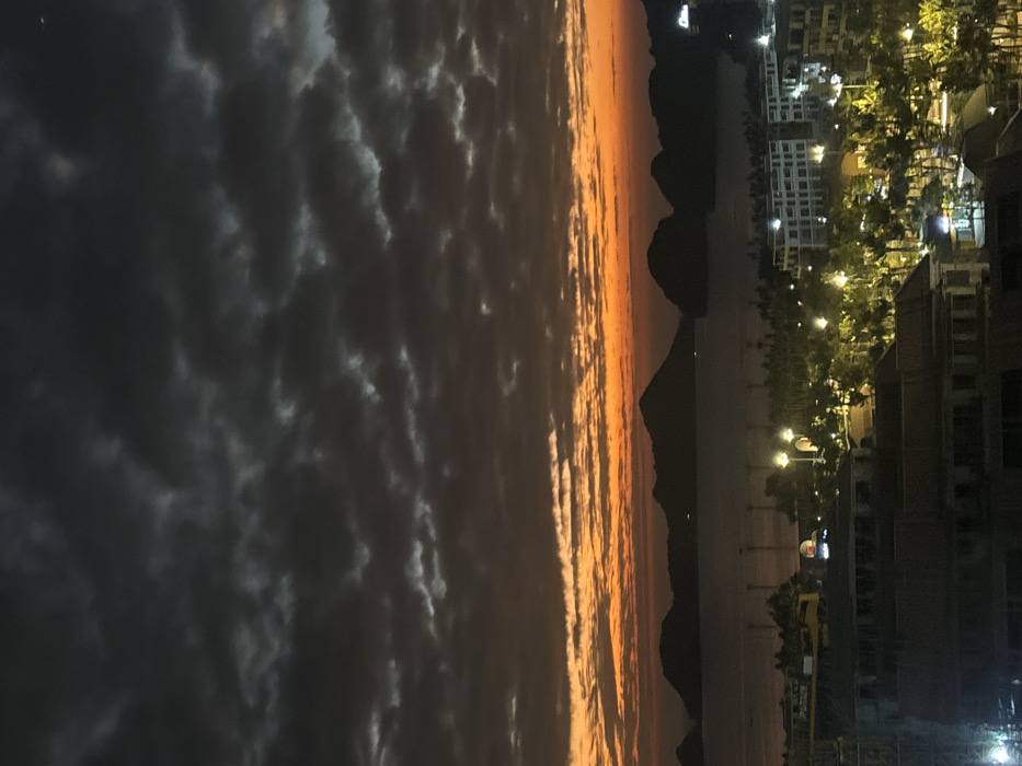 The image displays an elevated panoramic view of a coastal city at twilight, specifically identified as Hải Phòng, Vietnam. The sky occupies the upper two-thirds, characterized by dense, dark gray altocumulus clouds. A prominent horizontal band of intense orange and red light marks the horizon, signifying either sunrise or sunset. Below this, a wide expanse of dark water, consistent with a bay, reflects minimal light. Silhouetted against the bright horizon, a series of dark, rugged karstic islands or mountains rise from the water. The lower third of the frame presents an urban landscape featuring multiple multi-story buildings. These structures, some appearing residential or commercial, are illuminated by internal lights and streetlights. Numerous streetlights emit warm yellow and white light, highlighting roads and dense clusters of green foliage, likely tropical trees. No individuals or specific human activities are discernible within the scene.