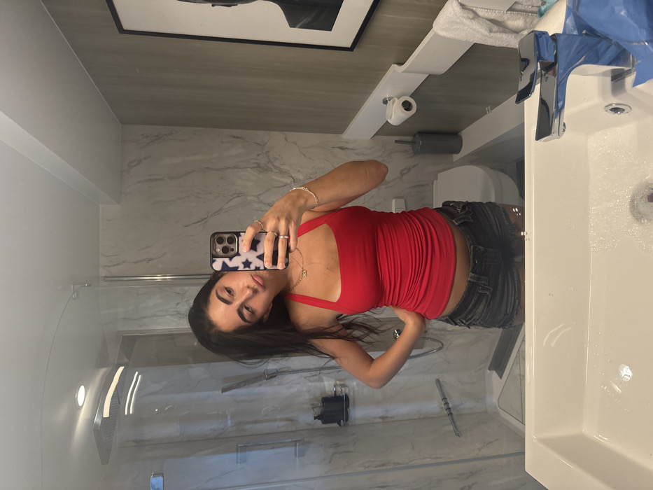 A female individual is depicted in a mirror reflection within a modern bathroom, located in Berry Islands, Bahamas. She has long dark hair and wears a red halter-neck tank top and dark denim cutoff shorts. Her left hand holds a smartphone, encased in a white and blue star-patterned cover, photographing her reflection. Multiple rings adorn her left hand, a silver bracelet is on her left wrist, and a gold chain necklace with a small pendant is visible. Her right hand rests on her hip, and her facial expression is a slight pout. The foreground shows a white rectangular sink with a chrome faucet, exhibiting water droplets. The bathroom's background features a glass-enclosed shower stall with white and gray marble-patterned walls, a rain showerhead, and a black soap dispenser. To the right, a partially visible white wall-mounted toilet, a dark gray toilet brush holder, a white wall-mounted shelf with a toilet paper roll, and a white towel on a rack are present. A framed black-and-white portrait of a profile hangs on the far right wall. Recessed overhead lighting is apparent, and the walls combine marble-patterned tile with light gray paneling.